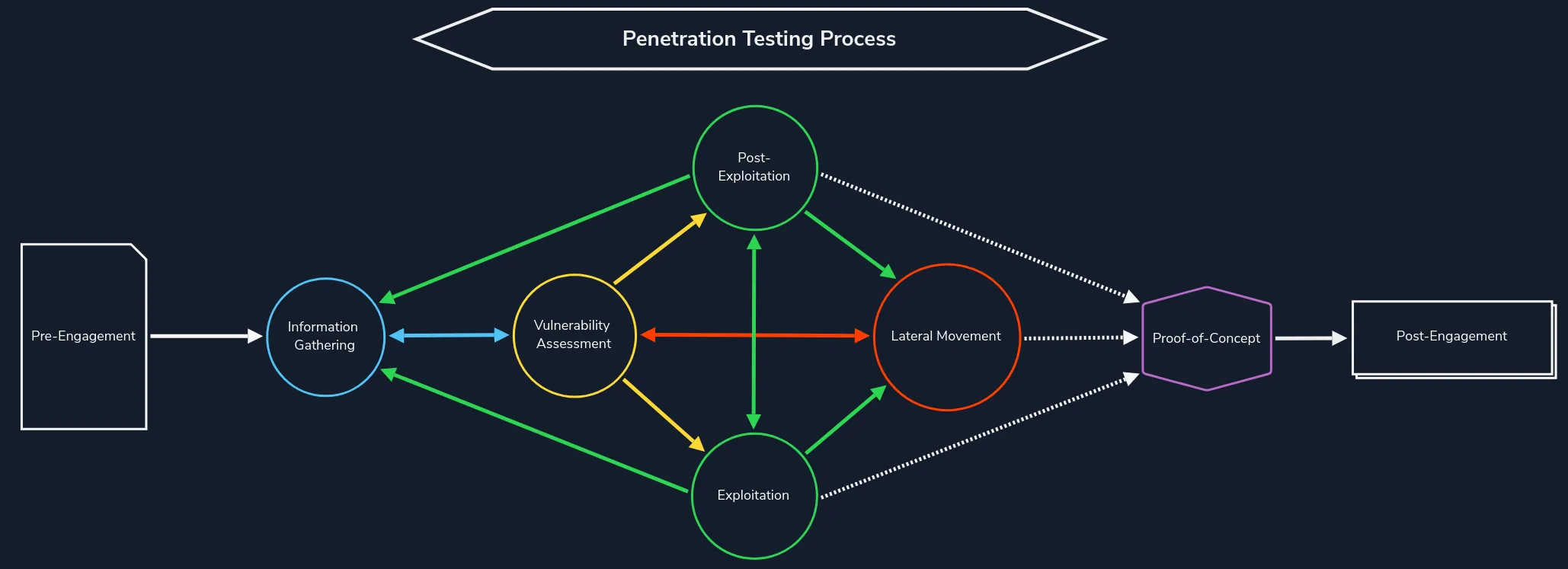 Section titled “Methodology”The course teaches every student from the get-go what their methodology looks like for every pentest.