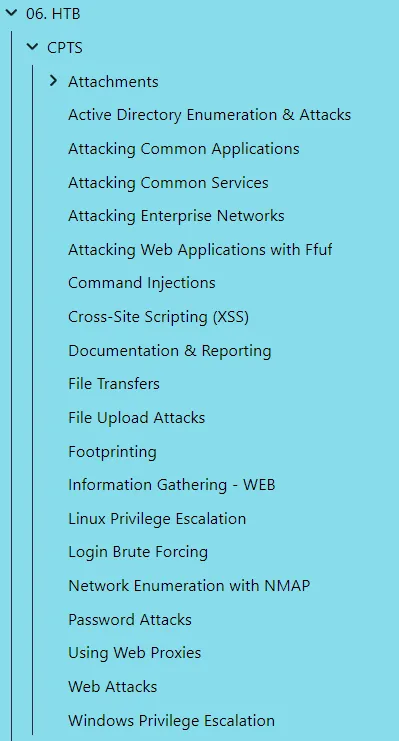 Section titled “Practice”Previous to the CPTS attempt I had already done over 140 boxes from both OffSec & HTB, however this has honestly done more bad than good. Although I had been able to hone my own methodology that I built upon the one given by HTB, I quickly found myself diving into self-made rabbit holes. I started enumerating for certain vulnerabilities that were completely out of scope or better yet, weren’t even taught during the course.