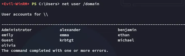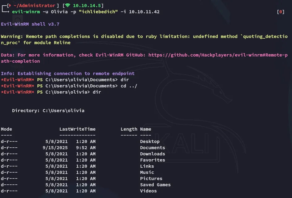 Section titled “evil-winrm - Olivia”I did some other enum as well before ultimately logging in via evil-winrm using the provided creds for Olivia: