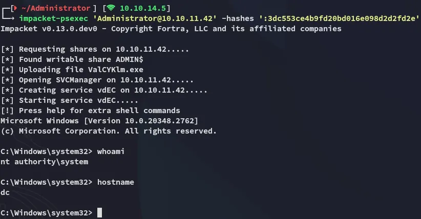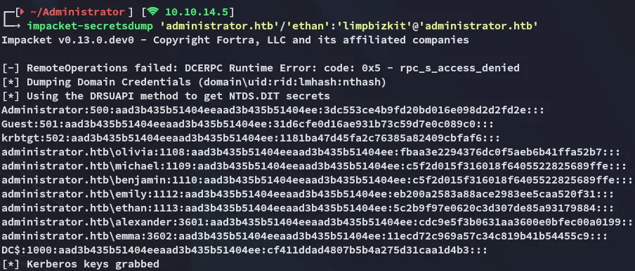 Section titled “DCSync”Now that I had Ethan’s creds I could easily abuse the DCSync privileges in combination with impacket-secretsdump: