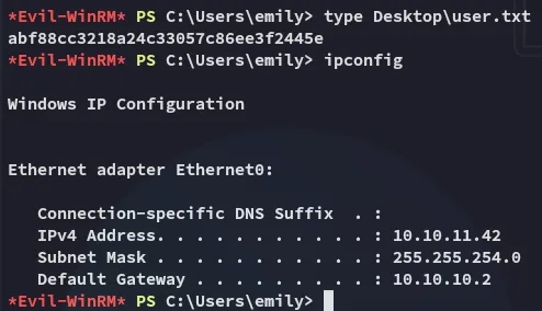 Section titled “user.txt”I logged in with the credentials for Emily and got the flag.