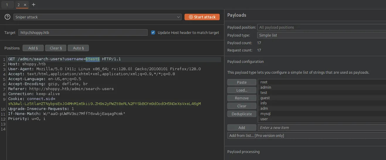 Using this knowledge we can initiate a burp Intruder attack where we use a list with usernames to fuzz for existing users.